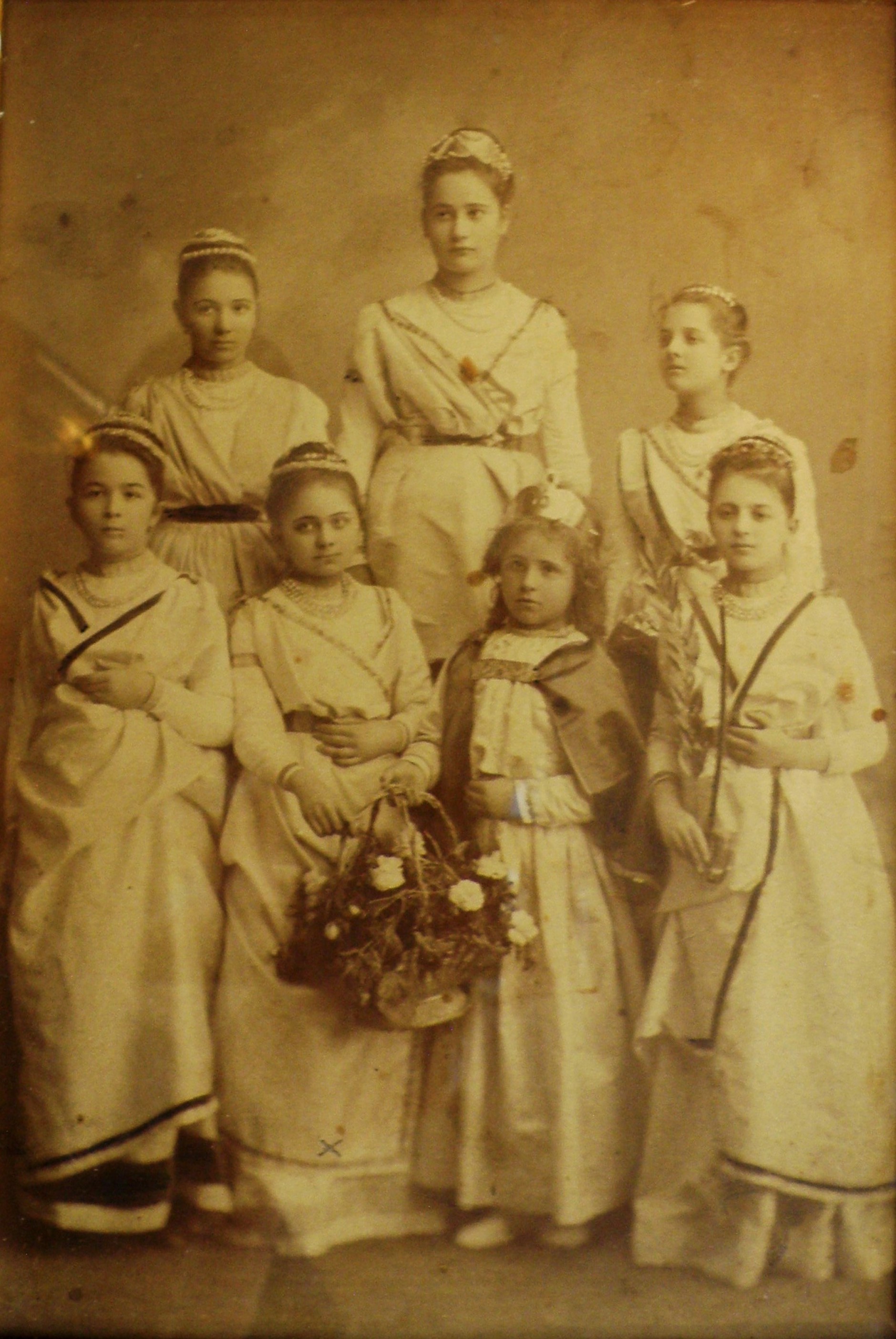 Marija Jurić (prvi red, druga slijeva) u Višoj djevojačkoj školi u samostanu sestara milosrdnica u Zagrebu, u predstavi „Kalista i Doroteja“ koju je napisala kad joj je bilo 14 godina; fotografija iz zbirke kolekcionara Josipa Kovačića