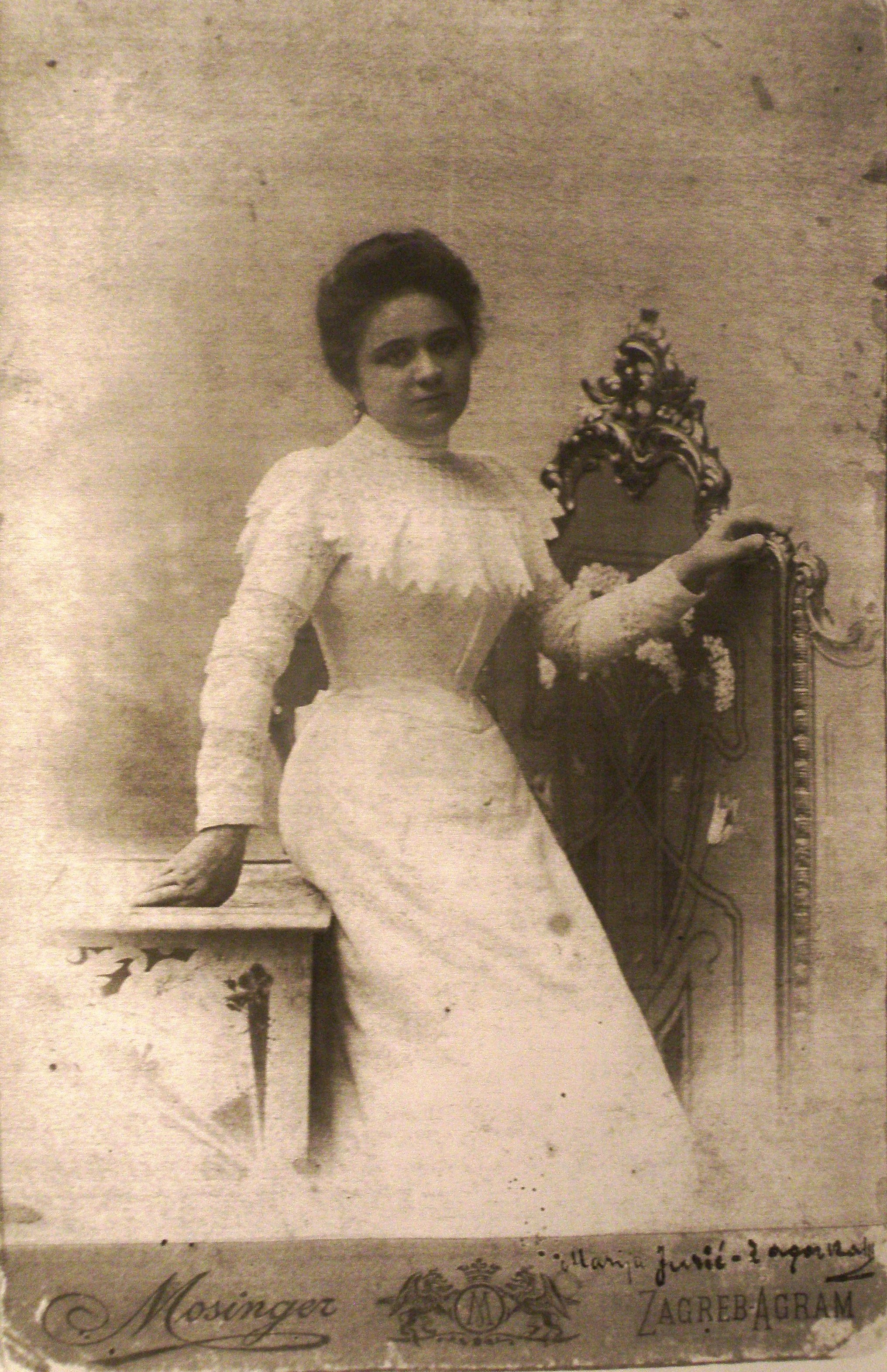 Marija Jurić Zagorka snimljena u poznatom zagrebačkom fotografskom ateljeu Mosinger, vjerojatno krajem 1890-ih; fotografija iz zbirke kolekcionara Josipa Kovačića