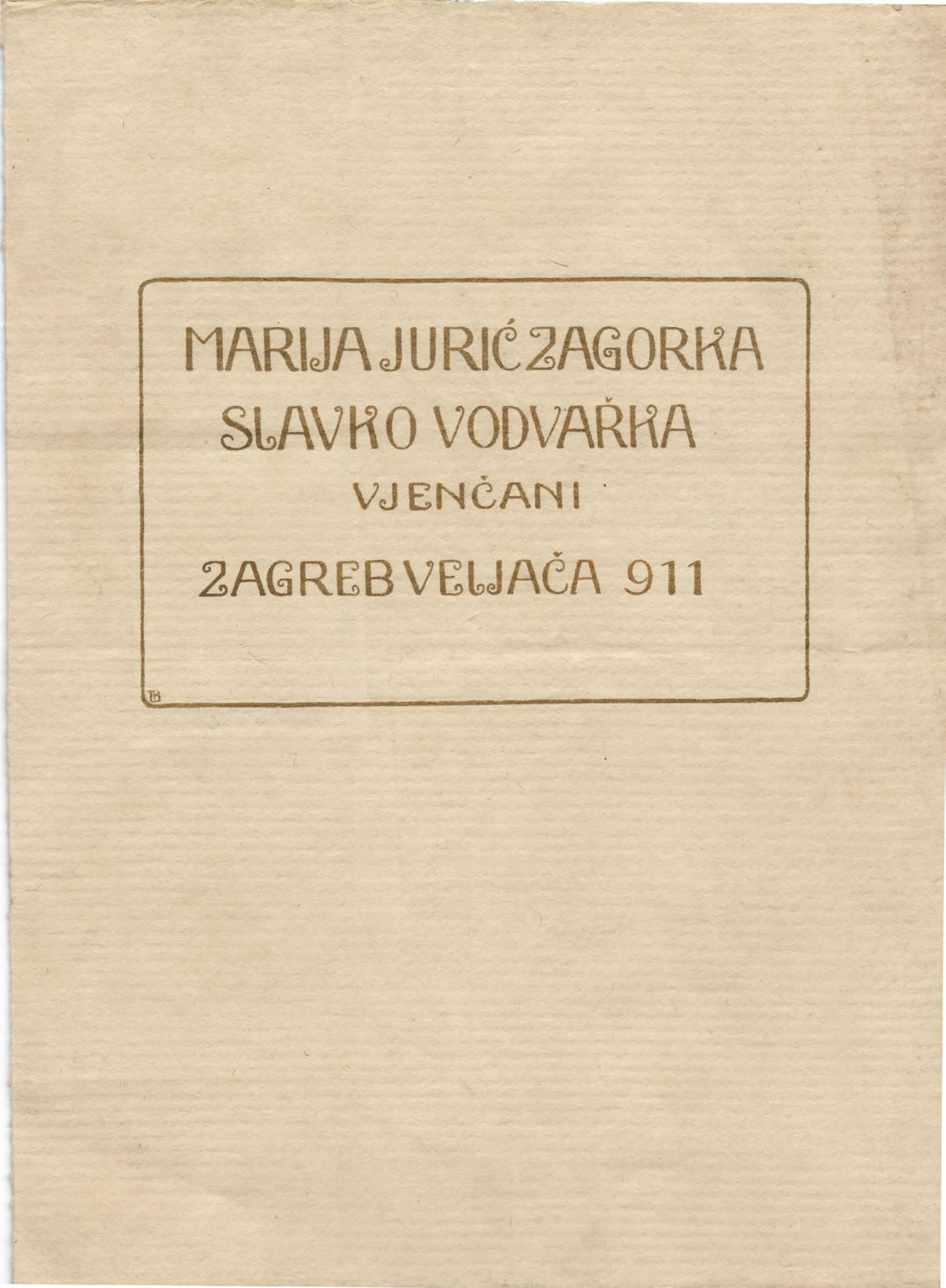 Omot vjenčanog lista Marije Jurić Zagorke i Slavka Vodvařke 1911.; foto: Arhivski fond Marije Jurić Zagorke