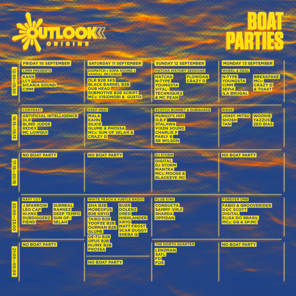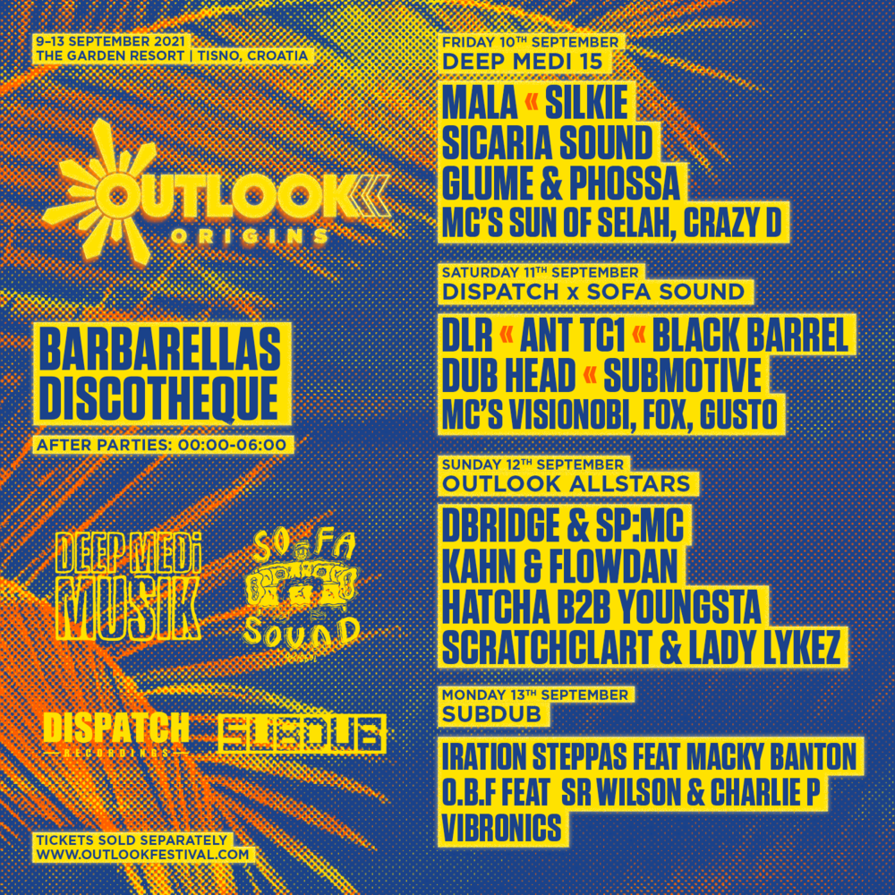 Kroz pet dana i pet noći, pozornice Outlooka zauzeti će preko 150 izvođača koji će naglasiti već spomenute temelje: dubstep, dub, reggae, drum’n’bass, jungle i grime i time ovo svjetsko slavlje sound system kulture učiniti nezaboravnim te okupiti plesače do ranih jutarnjih sati!