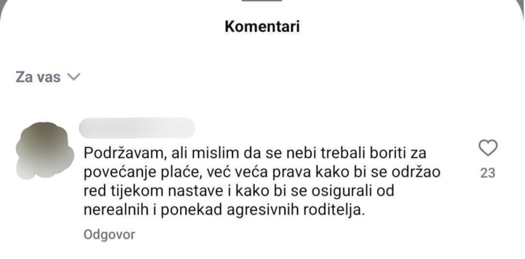 – Mislim da se ne bi trebali boriti za povećanje plaće, već veća prava kako bi se održao red tijekom nastave i kako bi se osigurali od nerealnih i ponekad agresivnih roditelja, stoji u komentaru čitatelja srednja.hr na vijest o najavi štrajka.